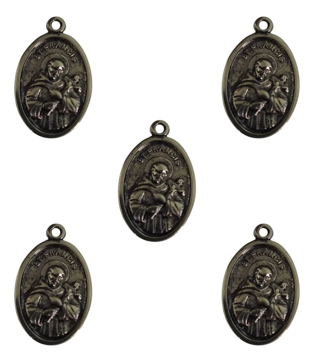 Kit com 5 medalhas pingente de São Francisco de Assis, ideais para confecção de colares, pulseiras ou lembrancinhas religiosas. As medalhas possuem formato oval e acabamento grafite, trazendo um visual clássico e elegante para suas criações.